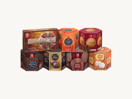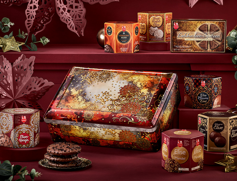 Printre altele, avem Cufărul exclusiv cunoscătorilor: cu un design in relief elaborat pe capac și pe laterale, cufărul în sine este o încântare pentru ochi. Dar ce se află înăuntru? Am împachetat 7 turte dulci diferite care te vor face să te topești: turta dulce Elisen în diferite modele, triunghiuri de turtă dulce și gustoasa Elise cu mere prăjite. Și, bineînțeles, nici Regina Elisen nu trebuie ratată. Așadar  tot ce ai nevoie pentru a trece peste sărbătorile de Crăciun bine și delicios, cu o ceașcă de ceai sau cafea.