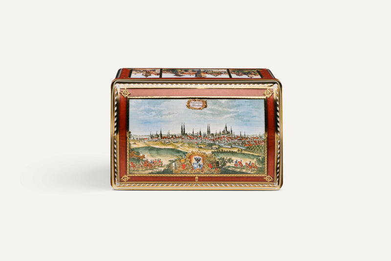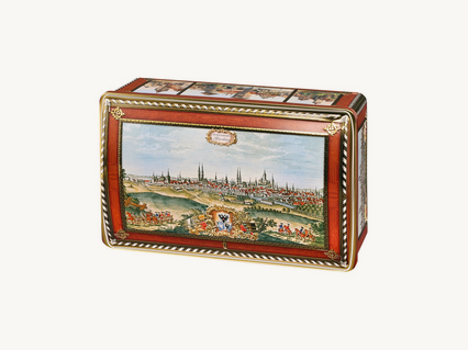Nürenberg are o istorie lungă și plină de evenimente – orașul natal al firmei Lebkuchen-Schmidt a fost menționat pentru prima dată în documentul Sigena încă din 1050, iar din 1219 s-a dezvoltat rapid în ceea ce este acum al doilea oraș ca mărime din Bavaria. Numeroase obiective turistice din orașul vechi povestesc despre istoria orașului Nürnberg, la fel și cufărul nostru istoric Nürenberg. Pentru toți fanii acestei frumoase metropole am conceput un cufăr special, care atrage cu adevărat atenția cu priveliști istorice și ornamente aurii în relief.
