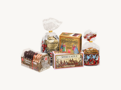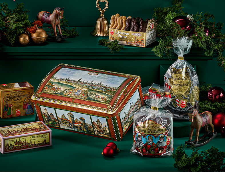 Așa cum se cuvine pentru Lebkuchen-Schmidt, am umplut, bineînțeles, și cufărul Nürenberg cu specialități de Crăciun din Nürnberg: am pus diverse turte dulci, fursecuri cu fructe și ciocolată și biscuiți picanți speculatius. Astfel toți cei care cumpără sau primesc cufărul se pot bucura de preparate în stil Nürenberg, admirând priveliștile orașului de pe cufăr.