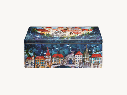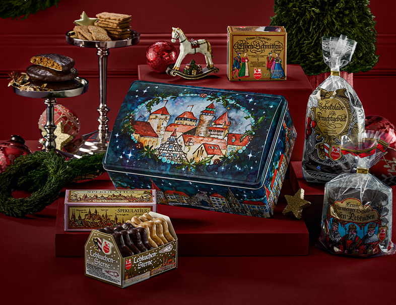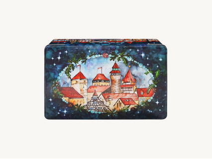 Numele Lebkuchen-Schmidt înseamnă delicii de Crăciun cu o notă franconiană. Ca adevărați locuitori ai orașului Nürenberg, suntem foarte atașați de patria noastră, ceea ce este evident în multe dintre produsele noastre. Luați, de exemplu, Cufărul Nürenberg Noaptea, unde Castelul Nürenberg, luminat de lună, invită vizitatorii de toate vârstele să viseze la vremurile trecute. Această imagine este romantică și de Crăciun, punând privitorul într-o dispoziție festivă chiar înainte de a fi gustat specialitățile coapte.