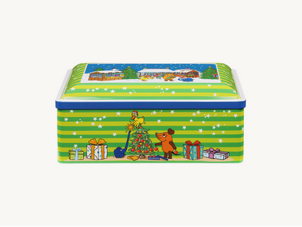 Pe cufărul nostru pentru copii, îl înfățișăm pe șoricel și pe prietenii săi – elefantul și rața – sărbătorind Crăciunul împreună, lângă un brad mare de Crăciun și bineînțeles cu o mulțime de cadouri.