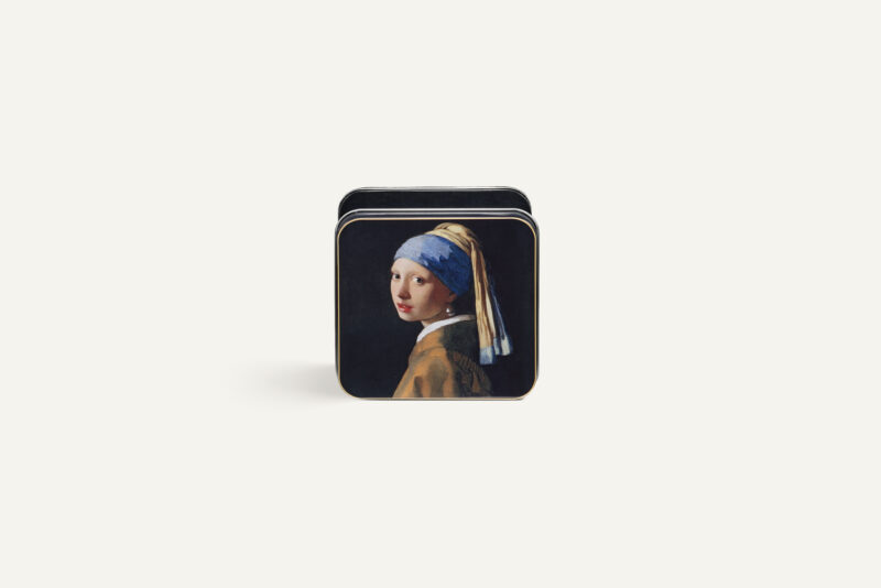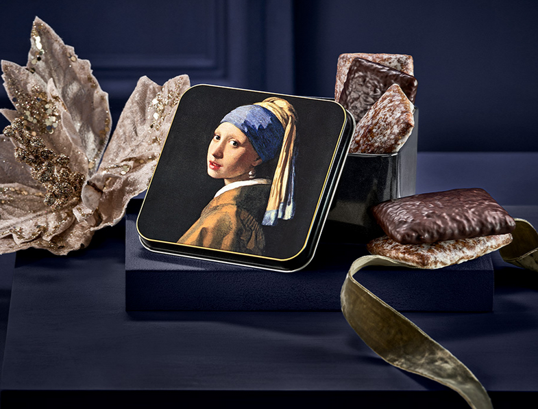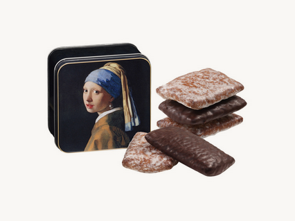 Răsfățul întâlnește capodopera: cutiile noastre artistice combină arta fină a turtei dulci cu pictura deosebită și transformă gustările într-o experiență estetică. Pentru această cutie cu cinci dintre cele mai fine felii mixte de turtă dulce Elisen, am ales o adevărată capodoperă: „Fata cu cercel de perlă” de Johannes Vermeer (1632–1675), unul dintre cei mai importanți pictori ai barocului olandez.