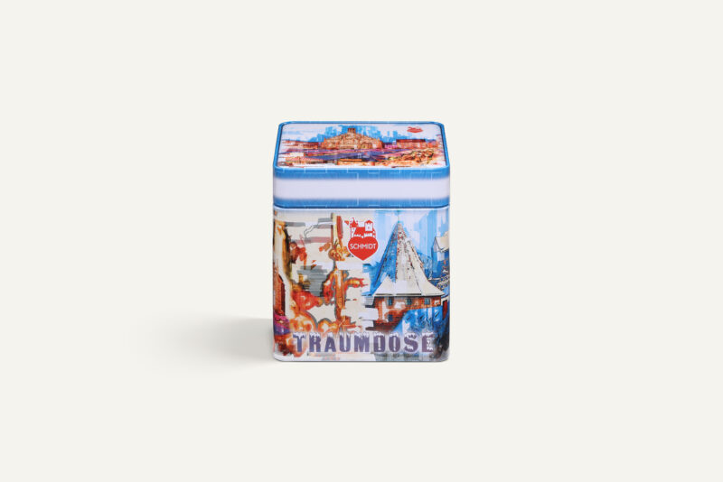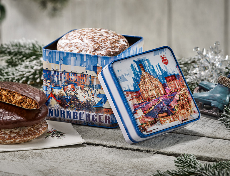 Această cutie metalică de la Lebkuchen-Schmidt este pur și simplu o încântare pentru ochi: am creat diverse repere din Nürnberg într-un mod colorat. Priveliștea este pur și simplu încântătoare și încântă atât inima, cât și ochii, cu culorile și formele sale.