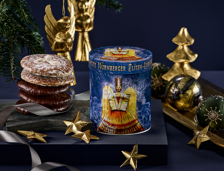 La exterior se află îngerașul din beteală din Nürnberg într-un stil unic. Nu există o modalitate mai bună de a oferi turtă dulce cadou: o încântare pentru ochi și palat. Pe deasupra cutia păstrează prospețimea delicioaselor produse de patiserie, dar este ideală și pentru depozitarea propriilor biscuiți.