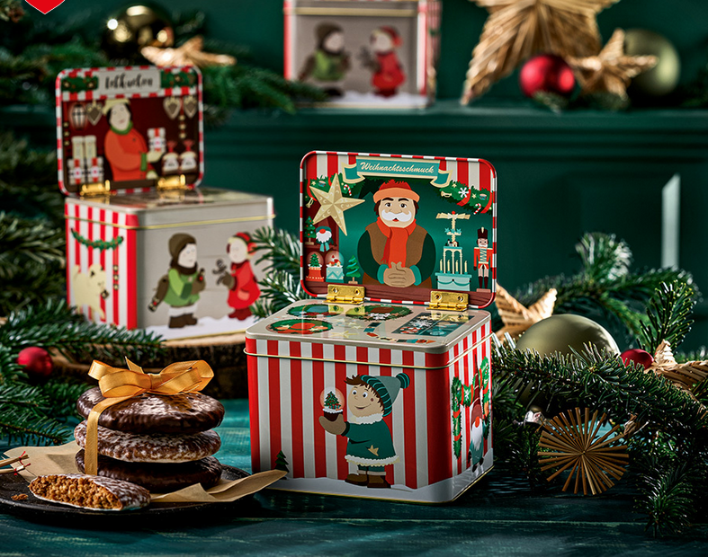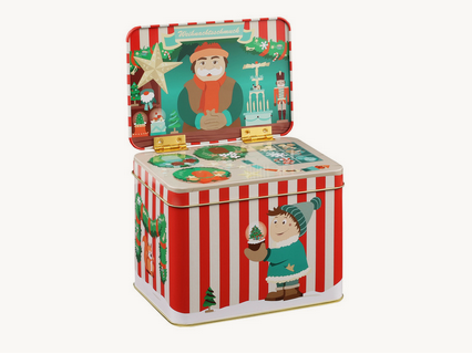 Doza încântătoare de la standul de Crăciun va încânta gurmanzii și colecționarii de toate vârstele. Această cutie metalică detaliată se transformă într-un fermecător stand Schmidt din turtă dulce imediat ce capacul este deschis, transportându-vă instantaneu în atmosfera magică a unei piețe de Crăciun.