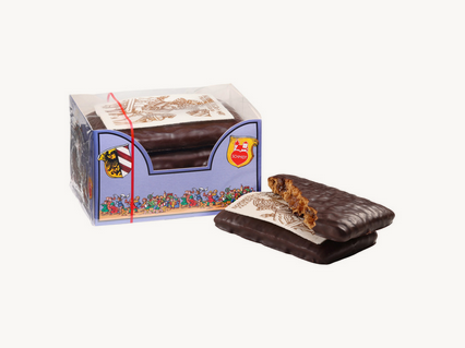 Iată-le pe farfuria cu biscuiți: dreptunghiulare, acoperite cu ciocolată, iar pe napolitana de deasupra se află o imagine a unui împărat din secolul al XV-lea. Muști din această turtă dulce și apoi vine surpriza fructată: o umplutură de portocale extrem de delicioasă! Suntem siguri că până acum și tu vei fi fan al Kaiserlein-ului nostru, turta dulce extraordinară cu acel plus fructat.