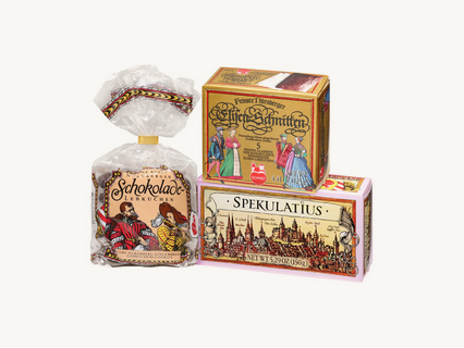 Feliile Elisen sunt reginele printre turta dulce, cu puțină făină în aluat, dar multă nucă și miere. Coapte pe o napolitană proaspătă și acoperite cu ciocolată sau glazură, sunt preferatele cunoscătorilor de turtă dulce. O altă delicatesă condimentată este Spekulatius, pe care îi coacem din cele mai bune ingrediente după o rețetă veche, prețuită. Trioul este completat de un pachet de turtă dulce cu ciocolată Nürenberg, un clasic din gama noastră.
