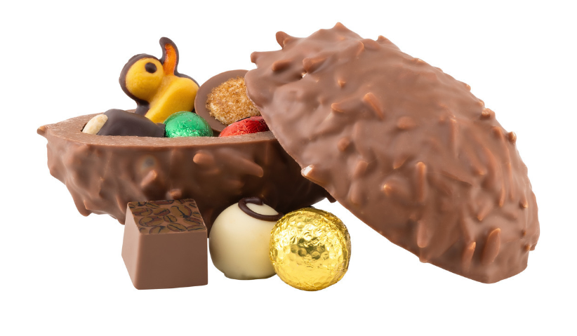 Surpriza de Paște cu umplutură de praline! Cine desface ambalajul oului nostru cu migdale, va vedea mai întâi ciocolata cu lapte și migdale, iar când oul este deschis, înăuntru se află praline delicioase și rafinate. Ciocolată învelită în ciocolată, adorată de toți iubitorii de dulce. Oul cu migdale este învelit în ceolofan festiv de Paște și legat cu o panglică galbenă mare și veselă. Oul cu migdale are o greutate de 170 grame, iar pralinele cu trufe cântăresc 70 grame.