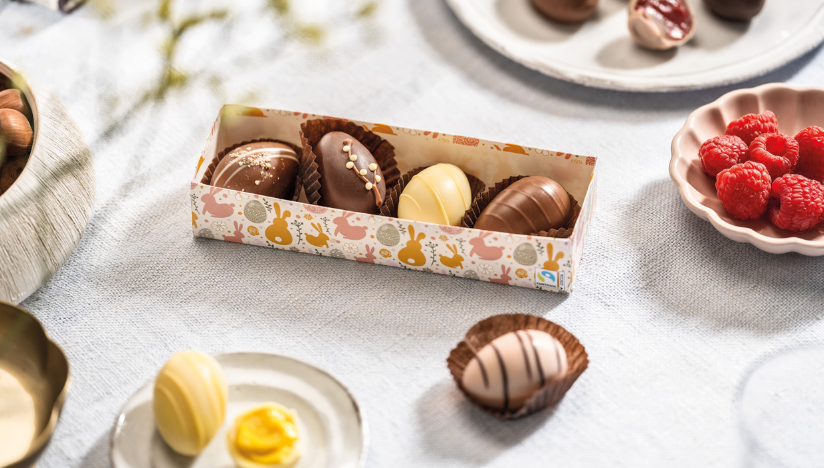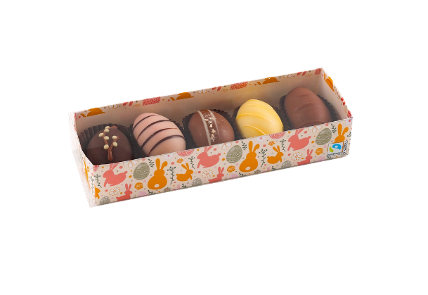 Pachetul nostru de ouă lucrate manual, conține cinci ouă de ciocolată rafinată, umplute cu delicatese alese. Această varietate asigură momente de pură plăcere, este ideală ca și cadou de Paște, dar și pentru a te răsfăța pur și simplu.