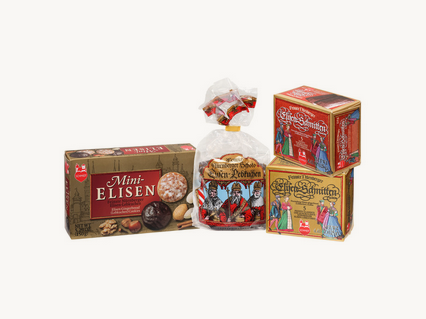 Descoperiți pachetul nostru exclusiv Elisen mic, o adevărată încântare pentru toți fanii turtei dulci Elisen. Selecția atent alcătuită include cea mai fină turtă dulce Elisen acoperită cu ciocolată, delicata mini turtă dulce Elisen în două variante, delicioase felii Elisen în două variante și felii Elisen acoperite cu ciocolată.