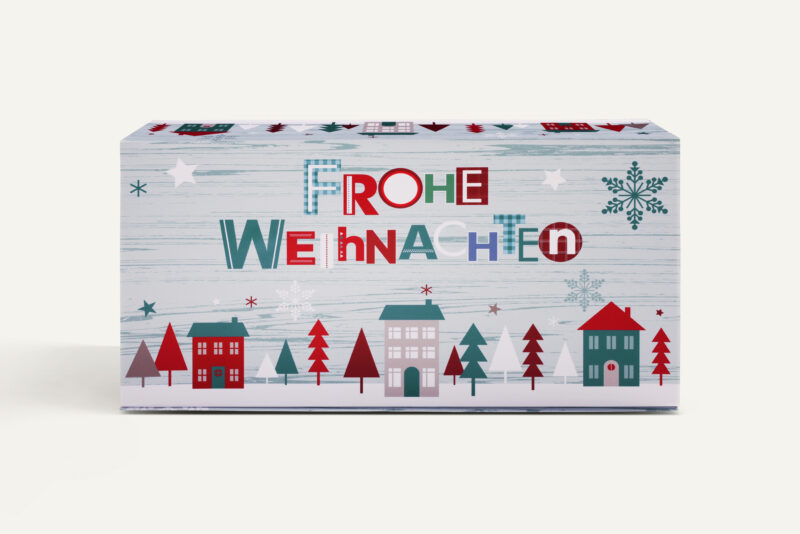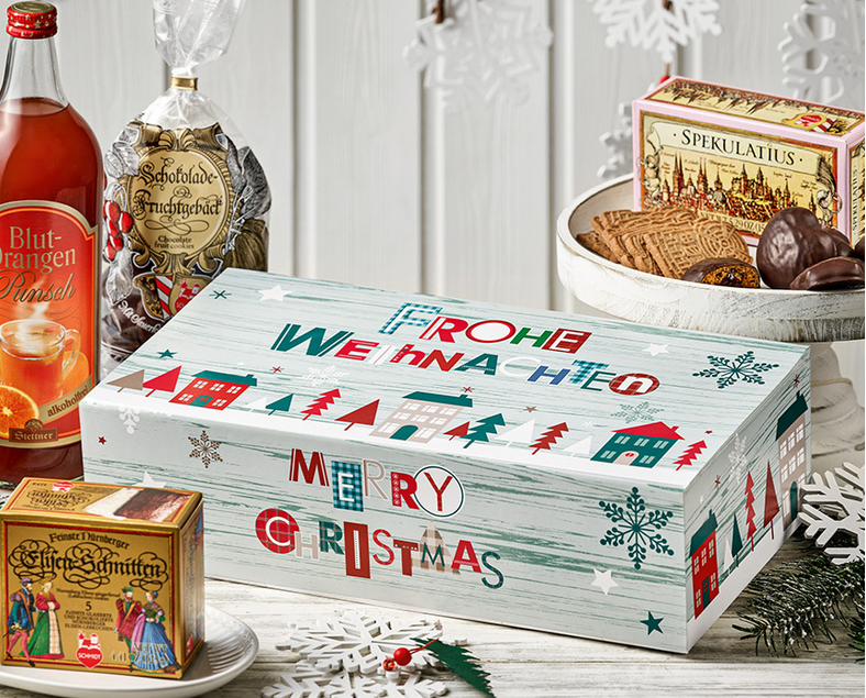 La exterior, o cutie frumos concepută cu motive de Crăciun, la interior plăcere festivă pură cu trei specialități dulci de Crăciun diferite din selecția noastră, completate de o sticlă de punch de portocale roșii fructate, acrișoare și fără alcool.